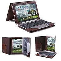 The good thing is that the keyboard holding portion is detachable by means of two metal snaps. So while we wait for a working keyboard, that portion is in a drawer. I haven't tried out if the Transformer pad will work with the keyboard attached and still be able to fit in the portfolio case. It is made with PU leather, or split leather, which, if I read right, has a thin piece of actual leather covered with a kind of plastic and embossed. One thing about it, it lived up to it's name of PU leather when I opened the bag for the first time. It certainly had a strong chemical paint like smell to it. It's not really noticeable now, but opening the bag for the first time certainly was an experience with the smell.It's a perfect product, keeps your keyboard and screen vary safe, and looks really professional.